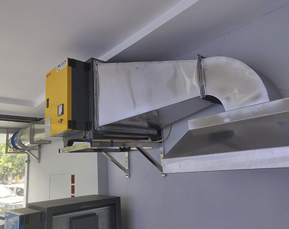項目介紹:該項目是一個新開的中餐館的油煙淨化器安裝,香蕉成人AV下载采用的是主次式的煙道截麵是兩個並排的矩形管道,煙管道也是筆直地貫穿各樓層。施工者一般會把這個煙道設置在住所每層中,同樣也會有一個用於銜接排油煙機和煙道的進風口。這樣主煙道和次煙就能夠道在進風口間隔處相匯。經過抽油煙機將煙氣先推入次煙道中,利用抽油煙機推進力以及油煙溫度的上浮力,使得油煙上升一段間隔後能再次進入主煙道從而排出屋麵。